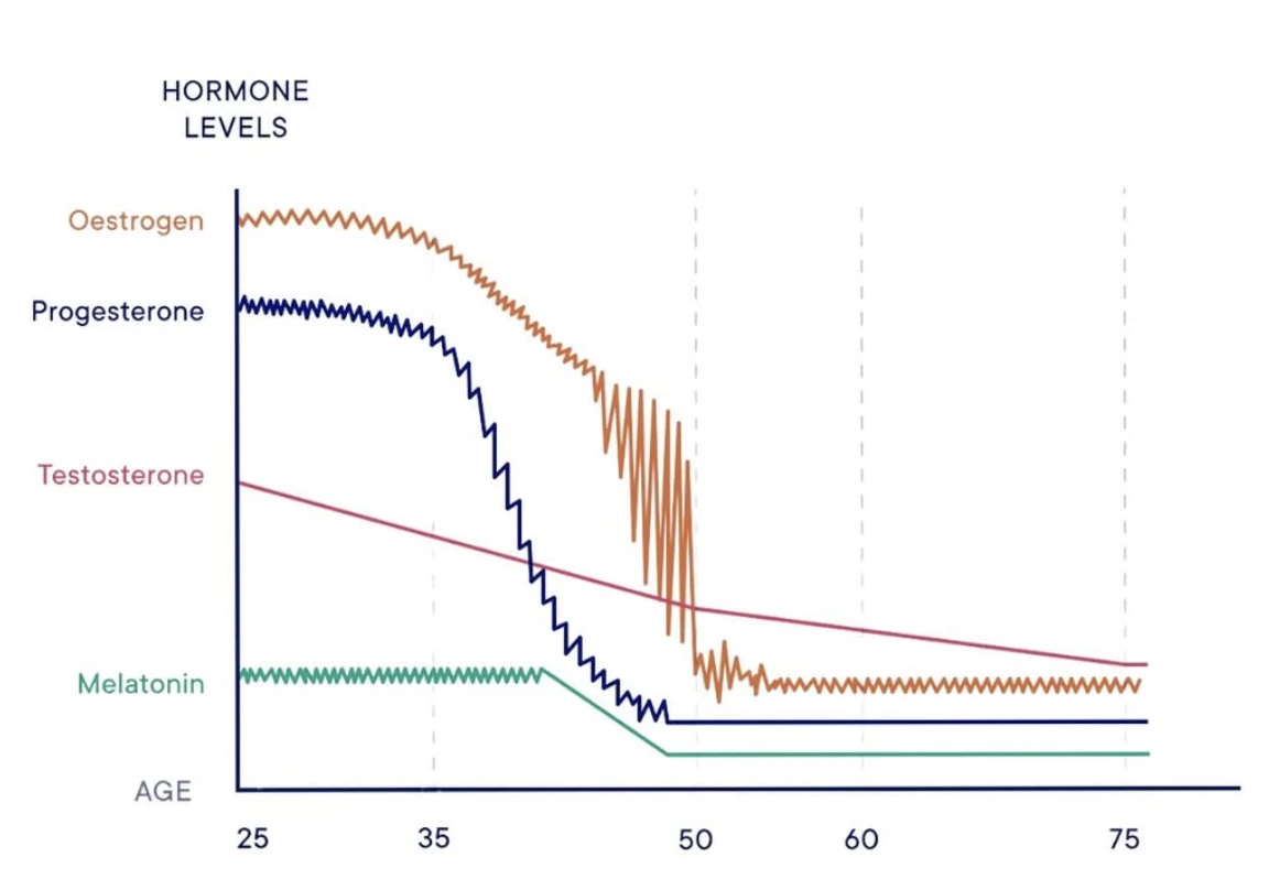 Та ви тільки подивіться, що витворяють естрогени в перименопаузальному періоді жінки, тобто десь між 45 та 50 років (верхня крива на графіку).