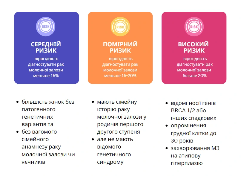 Існує багато факторів, що можуть підвищити ризик розвитку раку молочної залози. Всі фактори ризику можна поділити на три групи за походженням та можливість на них впливати.